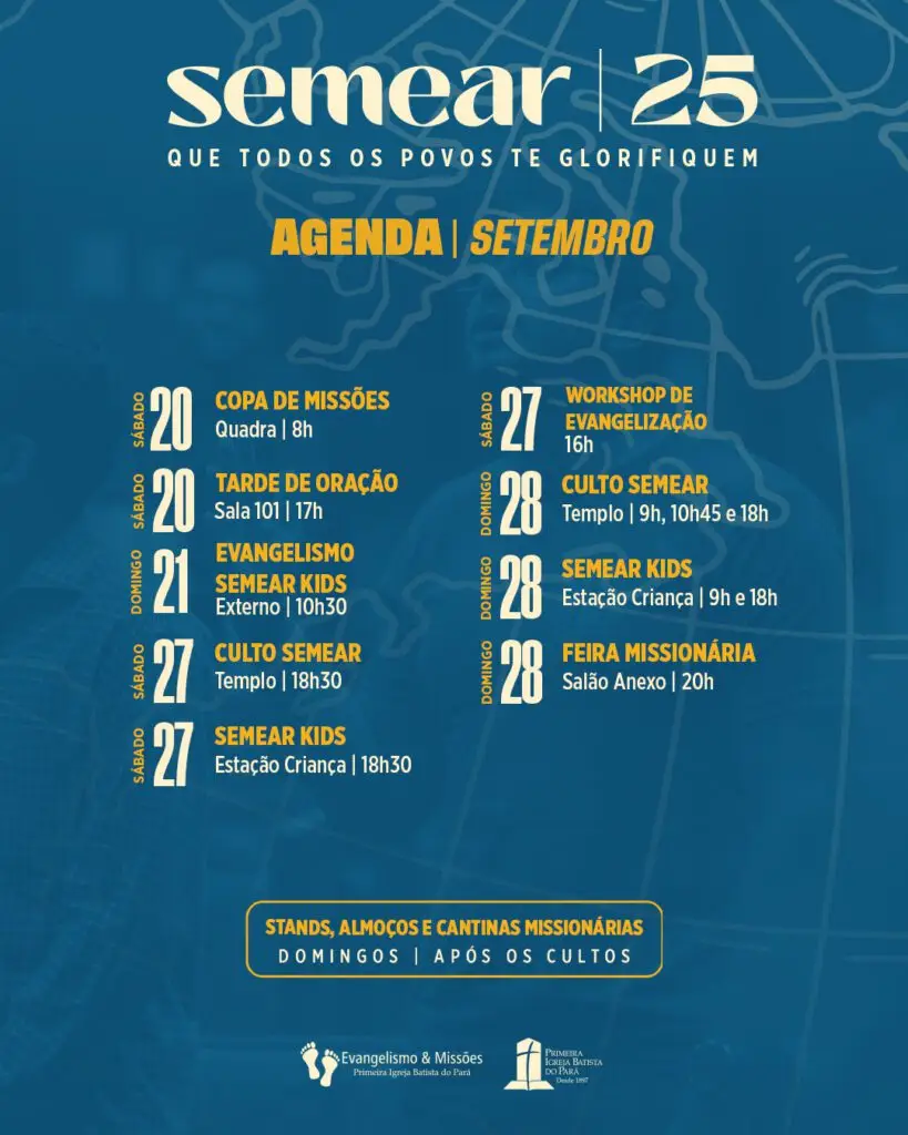 Aqui você encontra tudo o que vai acontecer neste Semear 25 - Edição Missões Nacionais. Onde, quando e que horas, para você se programar e não ficar de fora de nada.